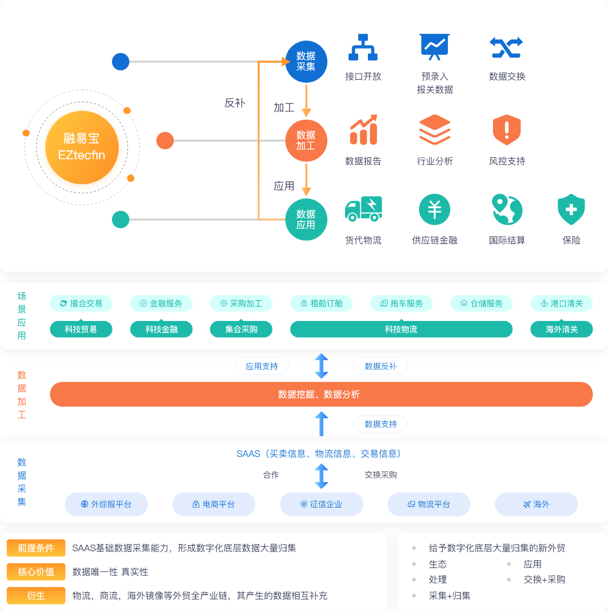 “亿海融”外贸供应链服务平台,依托进出口预录入报关数据的天然优势,在多样、复杂、专业的外贸场景下,还原外贸企业真实贸易行为,评估外贸企业既往业务规律,跟踪新业务动态。基于海量外贸核心数据的分析能力,将供应链金融、物流货代、外贸综合服务等进行整合。以外贸企业金融服务为切入点,持续为客户提供供应链服务及匹配更优质服务资源,形成资源互通,持续服务,互惠共赢的业务生态。