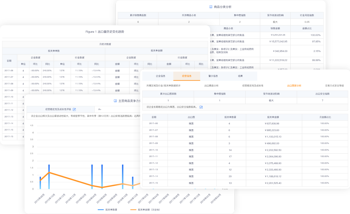 目前,“亿海融”平台已覆盖了全国近40%的实时报关数据。因报关数据本身的监管属性特质,使得报关数据具备唯一性、真实性、时效性等高价值属性。且数据字段数量多达上百个,内容涵盖企业、物流、交易、商品等关键信息,通过纵向深度挖掘与分析,结合行业数据进行横向对比,能够描绘出企业最真实的外贸全景,最全面的业务还原。